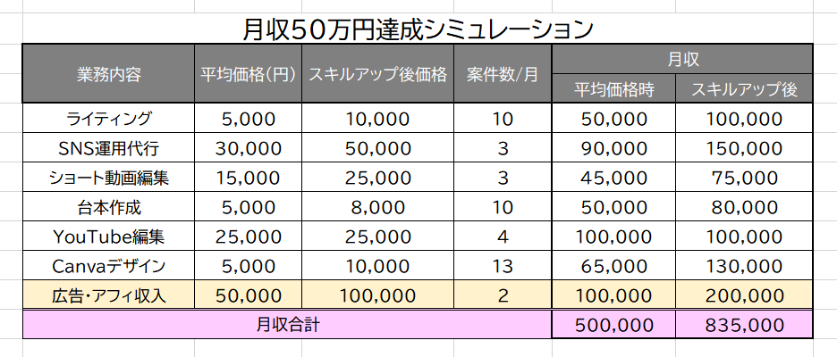 ✅ スキルアップ後の価格帯 に移行すれば、 案件数を減らしても50万円を達成可能 なので、 長期的には単価UPを狙うのがベスト!